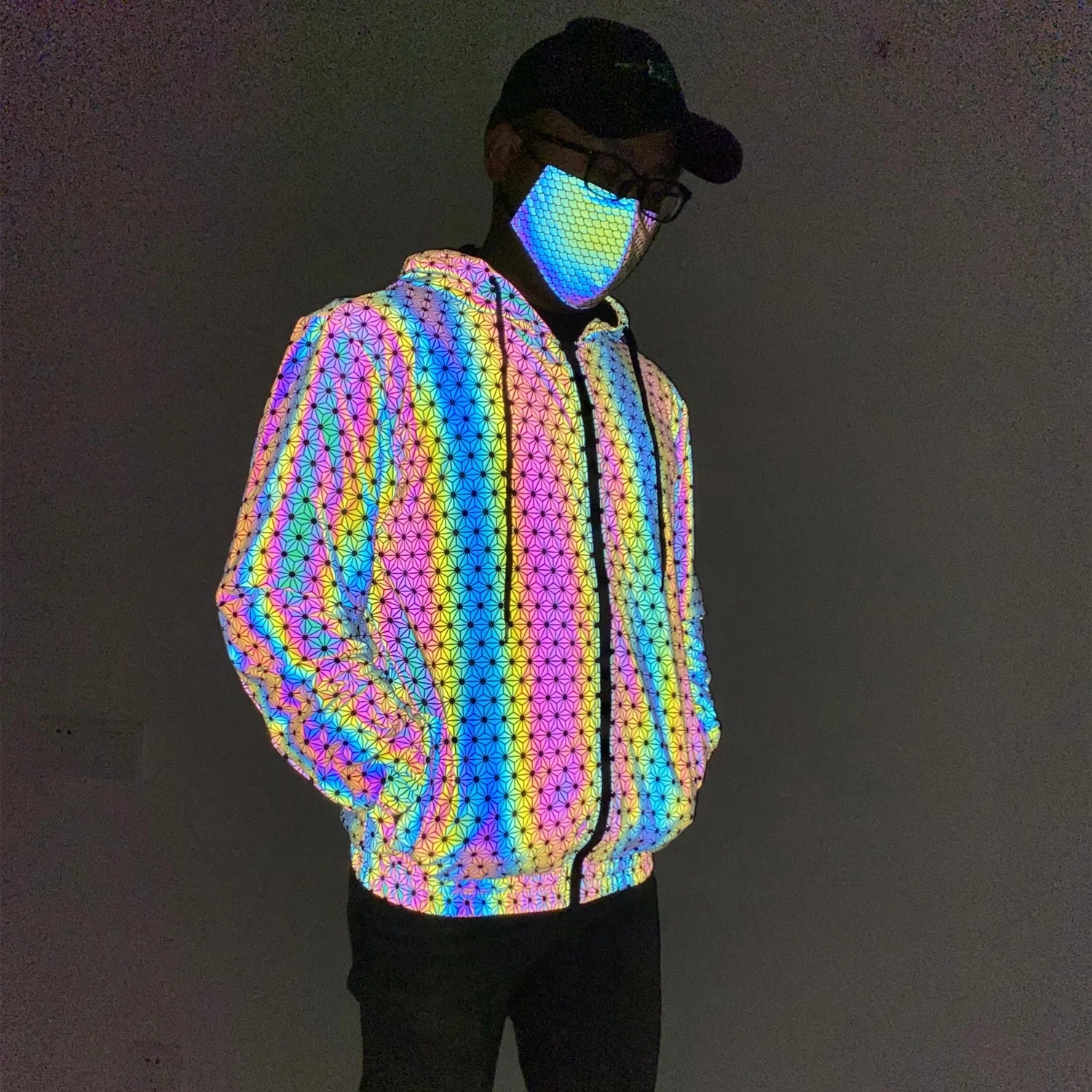 Men's Holographic Reflective "Geometric Pattern" Jacket Hip Hop Knitted Reflect Rainbow Casual Coats